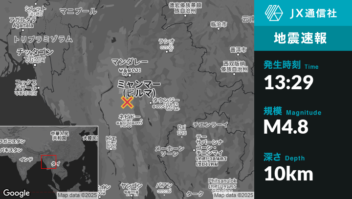 4月11日 13:29頃、ビルマ(ミャンマー)のMeiktilaから東北東14kmの地点でM4.8の地震がありました。