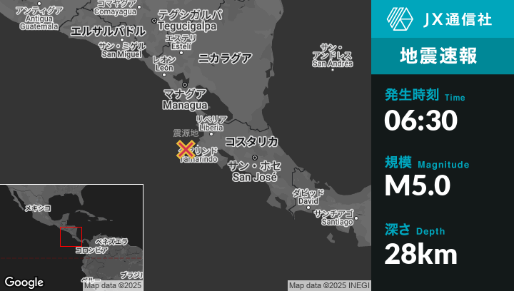 | 震源地 | コスタリカのTamarindoから西42kmの地点 |