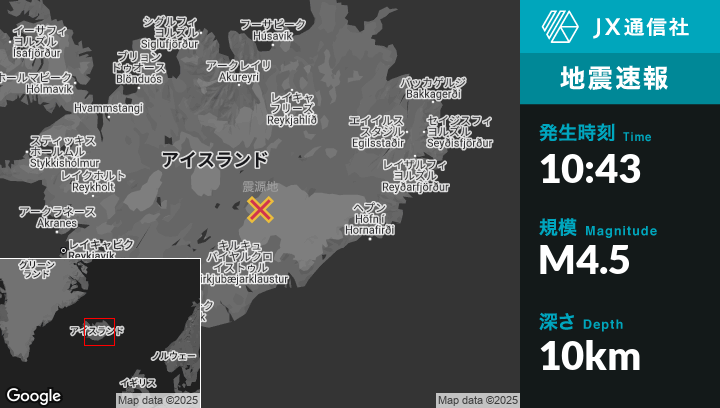 | 震源地 | アイスランドのHöfnから西北西121kmの地点 |