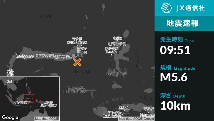 4月17日 09:51頃、インドネシアのModisiから東南東46kmの地点でM5.6の地震がありました。