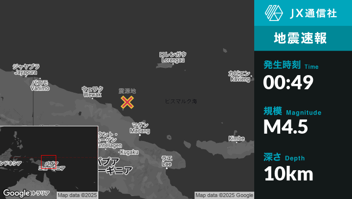 | 震源地 | パプアニューギニアのAngoramから東北東137kmの地点 |