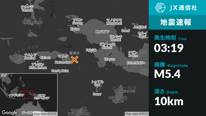 4月21日 03:19頃、インドネシアのFakfakから西南西152kmの地点でM5.4の地震がありました。