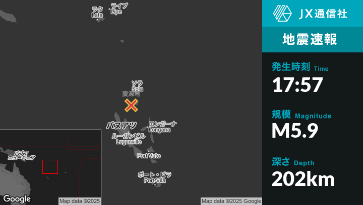 5月28日 17:57頃、バヌアツのSolaから南西52kmの地点でM5.9の地震がありました。