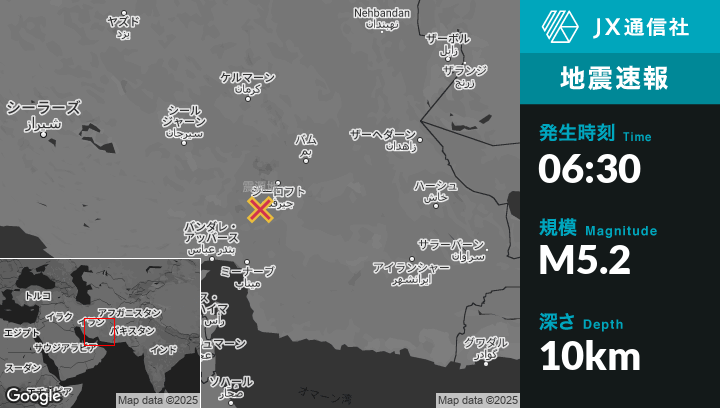 5月29日 06:30頃、イランのKūh Sefīdから南南東124kmの地点でM5.2の地震がありました。