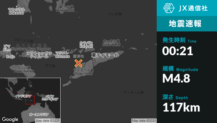6月01日 00:21頃、東ティモールのPante Makasarから西49kmの地点でM4.8の地震がありました。