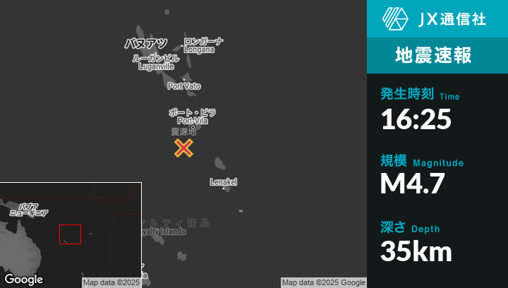 6月02日 16:25頃、バヌアツのPort-Vilaから南南西62kmの地点でM4.7の地震がありました。