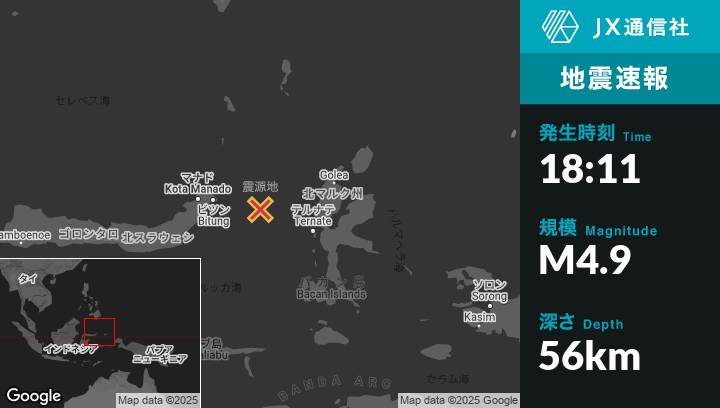 6月03日 18:11頃、インドネシアのBitungから東120kmの地点でM4.9の地震がありました。