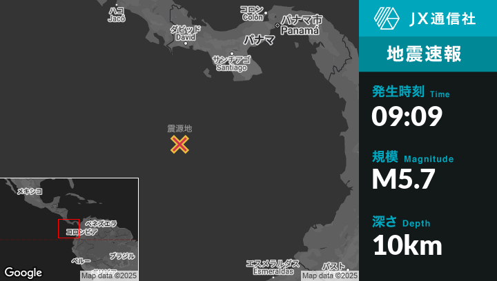 | 震源地 | パナマのArenasから南西299kmの地点 |