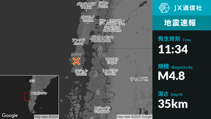 6月07日 11:34頃、チリのChonchiから西18kmの地点でM4.8の地震がありました。