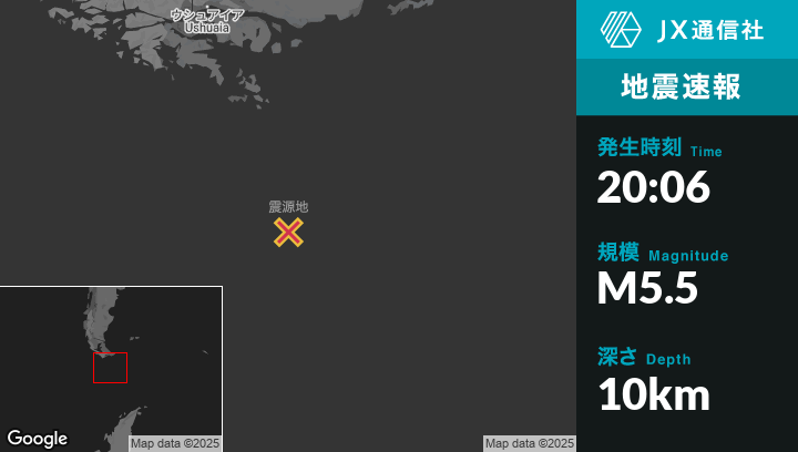 6月07日 20:06頃、アルゼンチンのUshuaiaから南南東289kmの地点でM5.5の地震がありました。