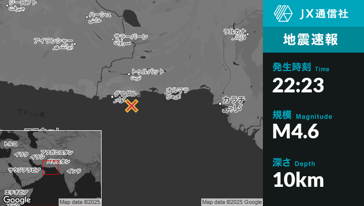6月14日 22:23頃、パキスタンのPasniから南西53kmの地点でM4.6の地震がありました。