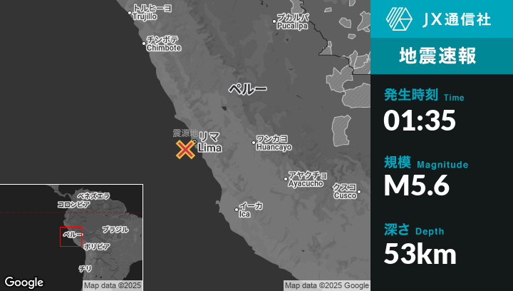 6月16日 01:35頃、ペルーのCallaoから西南西23kmの地点でM5.6の地震がありました。