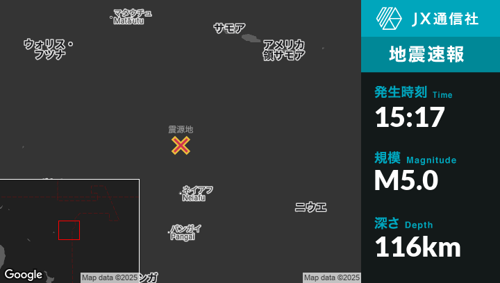 | 震源地 | トンガのHihifoから南125kmの地点 |