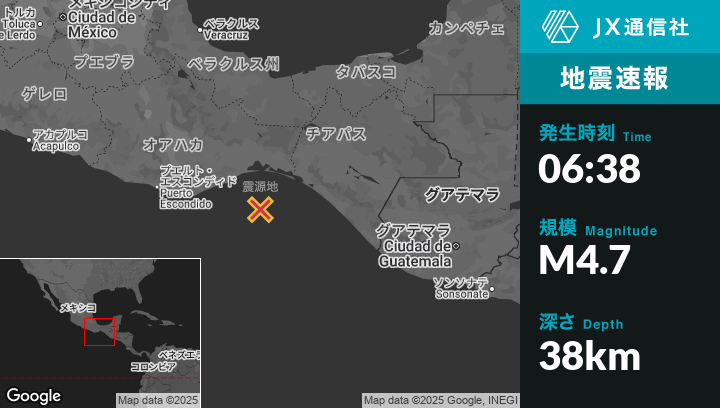 6月17日 06:38頃、メキシコのSan Mateo del Marから南南東79kmの地点でM4.7の地震がありました。