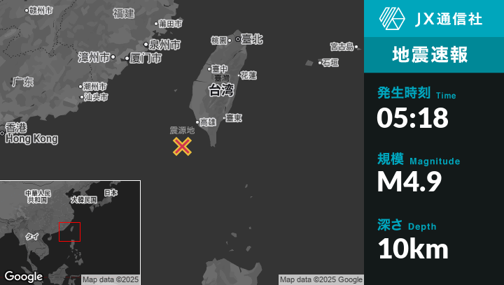 6月20日 05:18頃、台湾のDonggangから南西79kmの地点でM4.9の地震がありました。