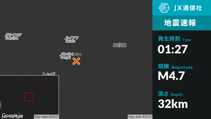 6月23日 01:27頃、トンガのFangale’oungaから東南東131kmの地点でM4.7の地震がありました。
