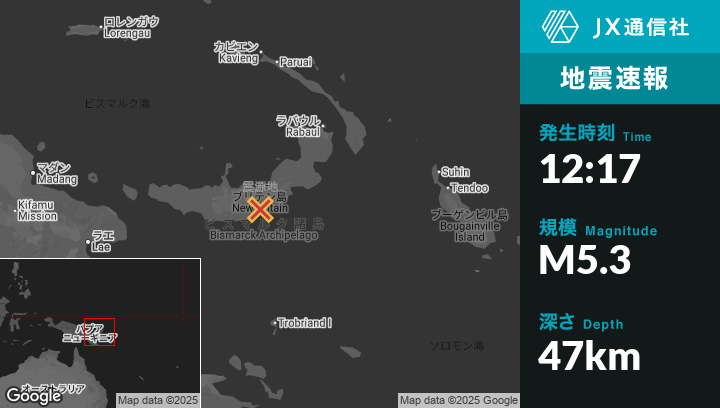 | 震源地 | パプアニューギニアのKimbeから東南東80kmの地点 |