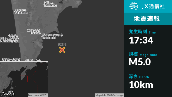 | 震源地 | ロシアのPetropavlovsk-Kamchatskyから南東145kmの地点 |