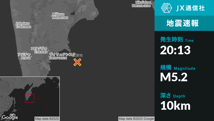 | 震源地 | ロシアのPetropavlovsk-Kamchatskyから東南東133kmの地点 |