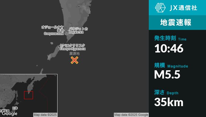 7月30日 10:46頃、ロシアのSevero-Kuril’skから南東103kmの地点でM5.5の地震がありました。