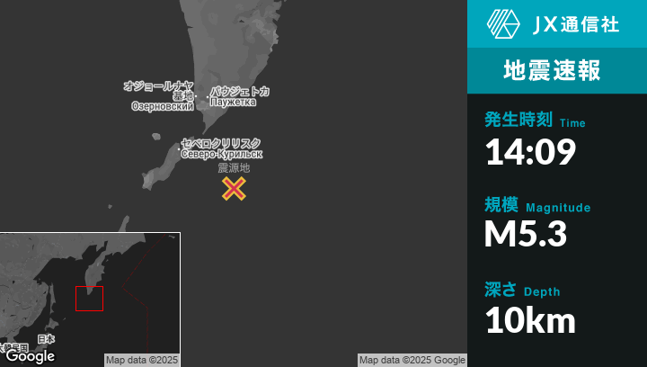 7月30日 14:09頃、ロシアのSevero-Kuril’skから東南東111kmの地点でM5.3の地震がありました。