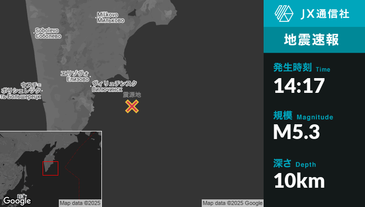 | 震源地 | ロシアのPetropavlovsk-Kamchatskyから東南東122kmの地点 |