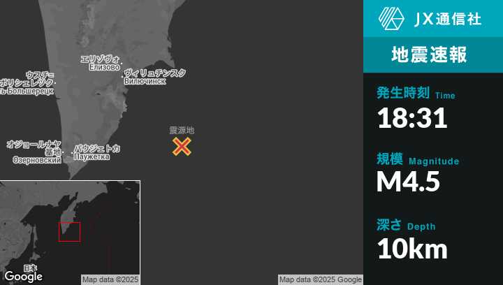 7月30日 18:31頃、ロシアのVilyuchinskから南東188kmの地点でM4.5の地震がありました。