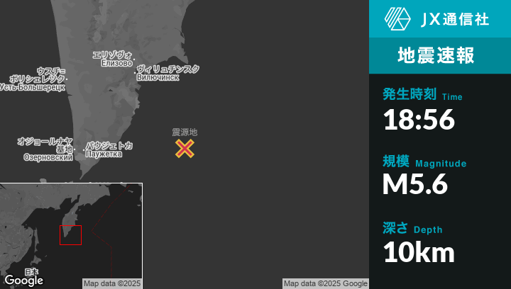 7月30日 18:56頃、ロシアのVilyuchinskから南東183kmの地点でM5.6の地震がありました。