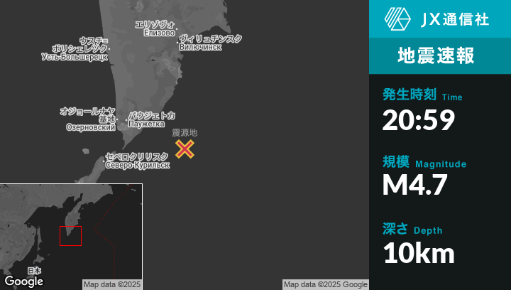 | 震源地 | ロシアのOzernovskiyから東南東159kmの地点 |