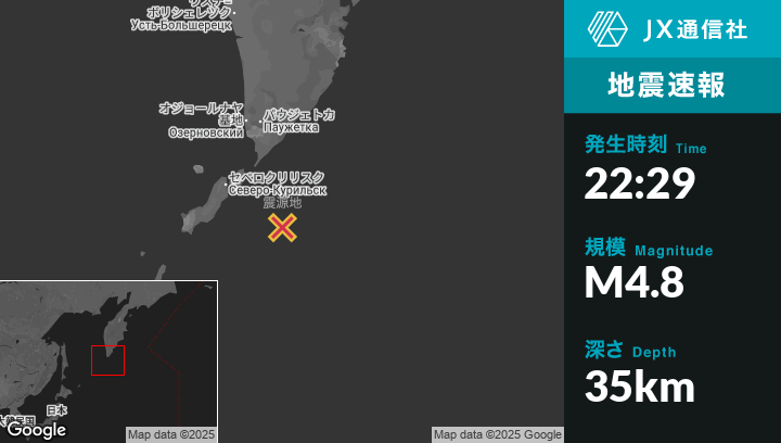 7月30日 22:29頃、ロシアのSevero-Kuril’skから南東96kmの地点でM4.8の地震がありました。