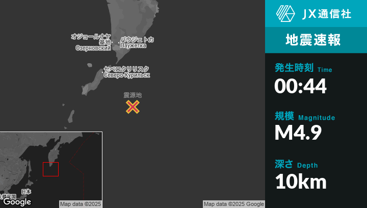 | 震源地 | ロシアのSevero-Kuril’skから南東134kmの地点 |