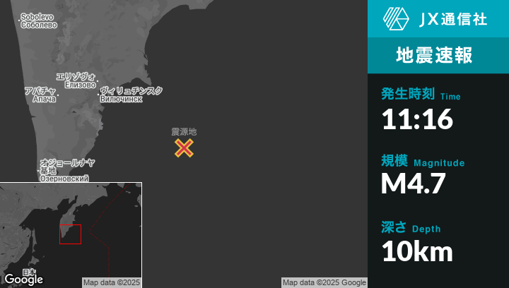 | 震源地 | ロシアのPetropavlovsk-Kamchatskyから南東203kmの地点 |