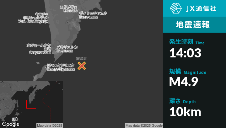 7月31日 14:03頃、ロシアのOzernovskiyから東南東166kmの地点でM4.9の地震がありました。