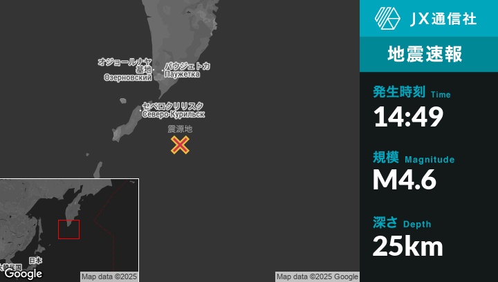 7月31日 14:49頃、ロシアのSevero-Kuril’skから南東112kmの地点でM4.6の地震がありました。