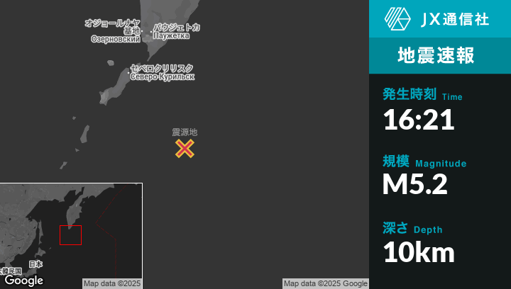 7月31日 16:21頃、ロシアのSevero-Kuril’skから南東202kmの地点でM5.2の地震がありました。