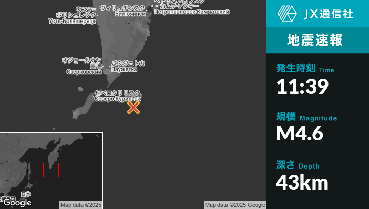 8月01日 11:39頃、ロシアのSevero-Kuril’skから東南東123kmの地点でM4.6の地震がありました。