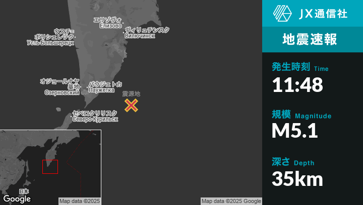 | 震源地 | ロシアのOzernovskiyから東南東163kmの地点 |