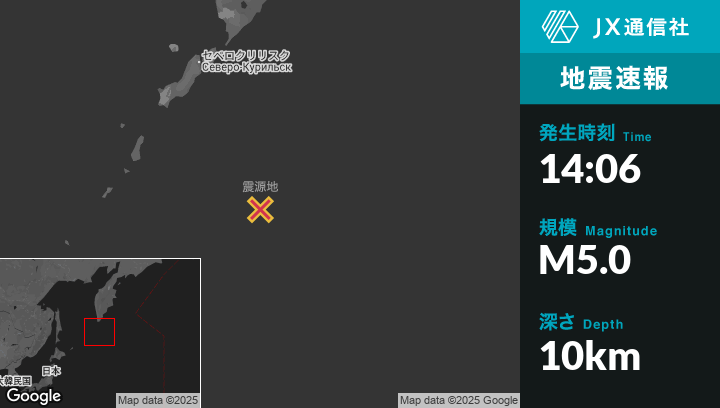 | 震源地 | ロシアのSevero-Kuril’skから南南東245kmの地点 |