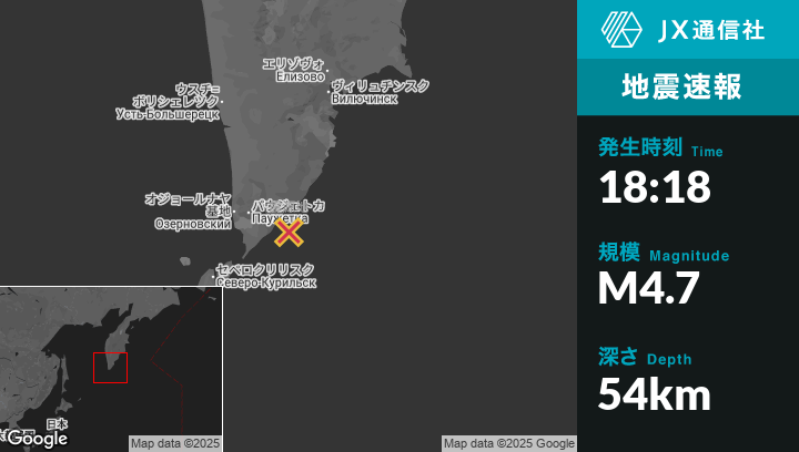 | 震源地 | ロシアのOzernovskiyから東南東80kmの地点 |
