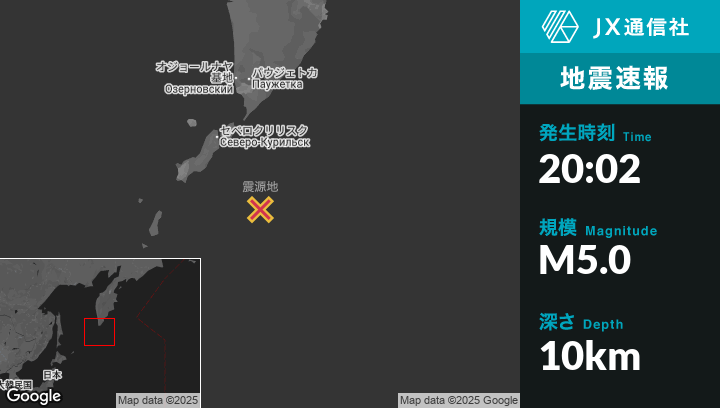 | 震源地 | ロシアのSevero-Kuril’skから南南東125kmの地点 |