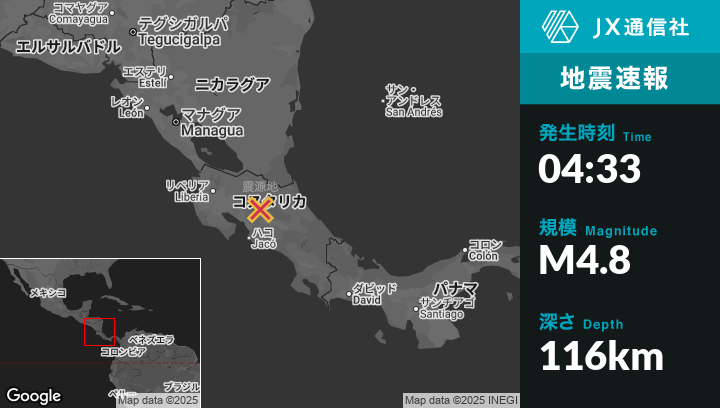 | 震源地 | コスタリカのQuesadaから東北東4kmの地点 |