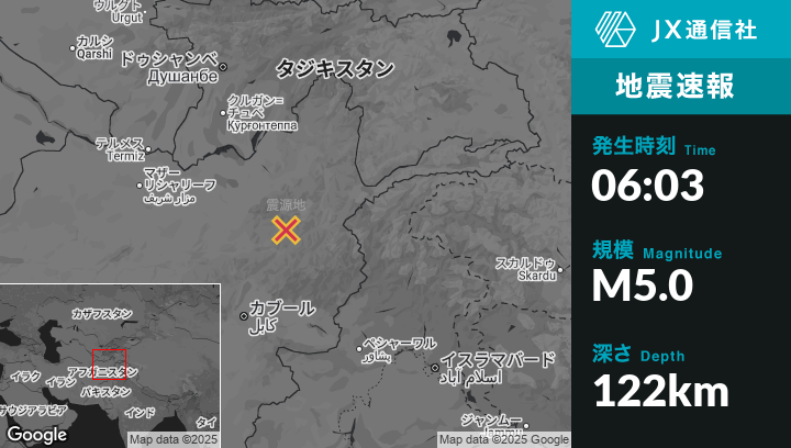 8月02日 06:03頃、アフガニスタンのFarkhārから南南東58kmの地点でM5.0の地震がありました。