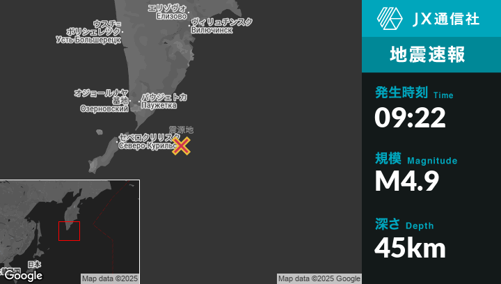 | 震源地 | ロシアのSevero-Kuril’skから東141kmの地点 |