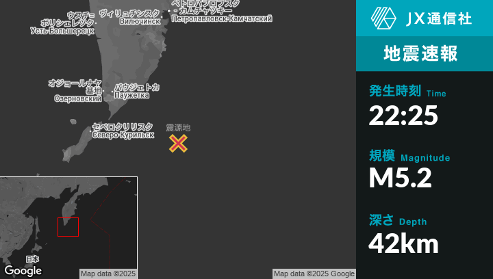 | 震源地 | ロシアのSevero-Kuril’skから東198kmの地点 |
