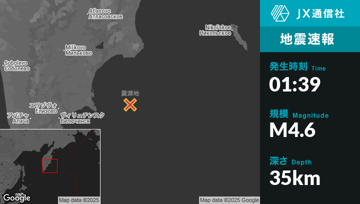 8月04日 01:39頃、ロシアのPetropavlovsk-Kamchatskyから東196kmの地点でM4.6の地震がありました。
