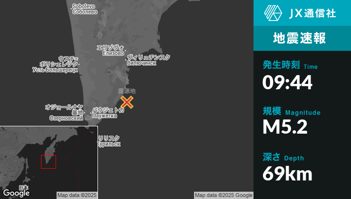 8月04日 09:44頃、ロシアのVilyuchinskから南120kmの地点でM5.2の地震がありました。