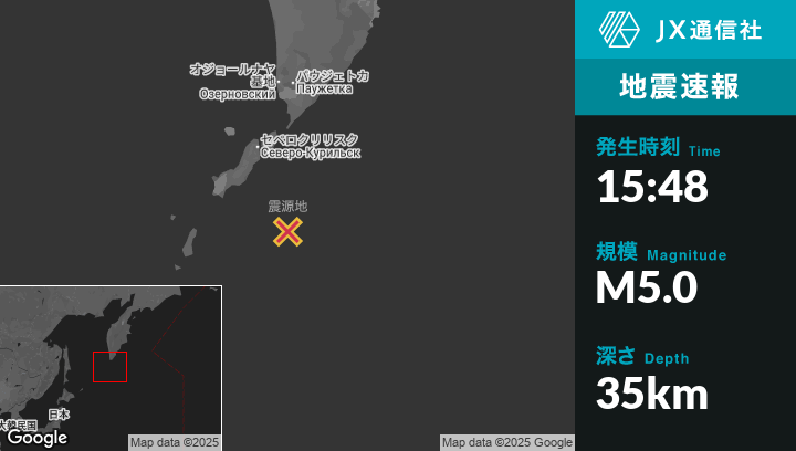 | 震源地 | ロシアのSevero-Kuril’skから南南東118kmの地点 |