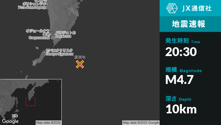 8月04日 20:30頃、ロシアのSevero-Kuril’skから東南東183kmの地点でM4.7の地震がありました。