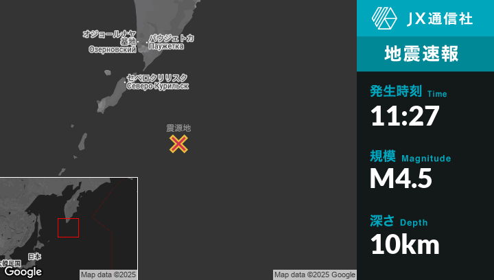 | 震源地 | ロシアのSevero-Kuril’skから南東180kmの地点 |