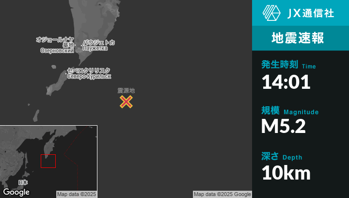 8月06日 14:01頃、ロシアのSevero-Kuril’skから東南東209kmの地点でM5.2の地震がありました。
